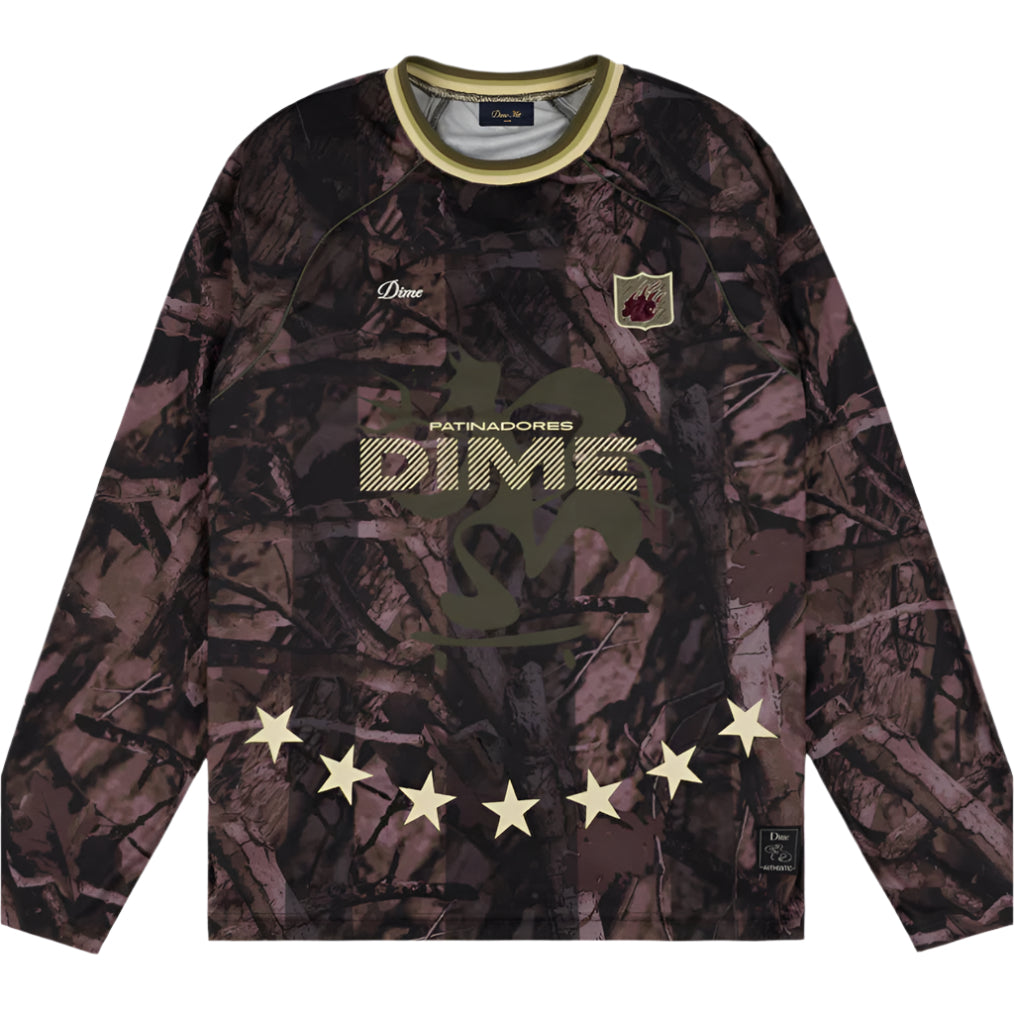 100% Polyester. Soccer jersey. Allover stripe print. Stripe print on rib collar. Puzzle patch artwork at left chest. Double topstitched sleeves and bottom hem finishing. Contrast piping along wavy raglan seams. Cursive embroidery at right chest. Silicone printed artwork at center front. Dime Authentic labeling at bottom left