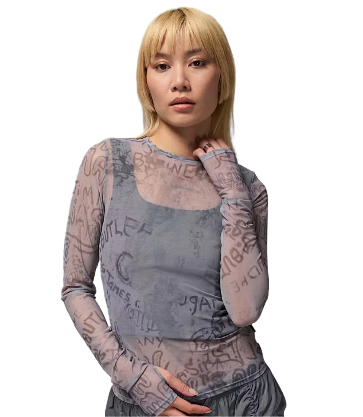Sheer, sculpted, and unapologetically bold—the Air Jordan Mesh Long-Sleeve Top in Dark Smoke Grey is more than a layer, it's a statement. With lightweight stretch mesh that hugs in all the right places and thumbhole sleeves built for movement, this top channels street-sleek energy with every step. Subtle Jordan branding and a tonal print nod to heritage while keeping the look elevated and modern. Wear it solo or layered—either way, you’re leading with confidence.