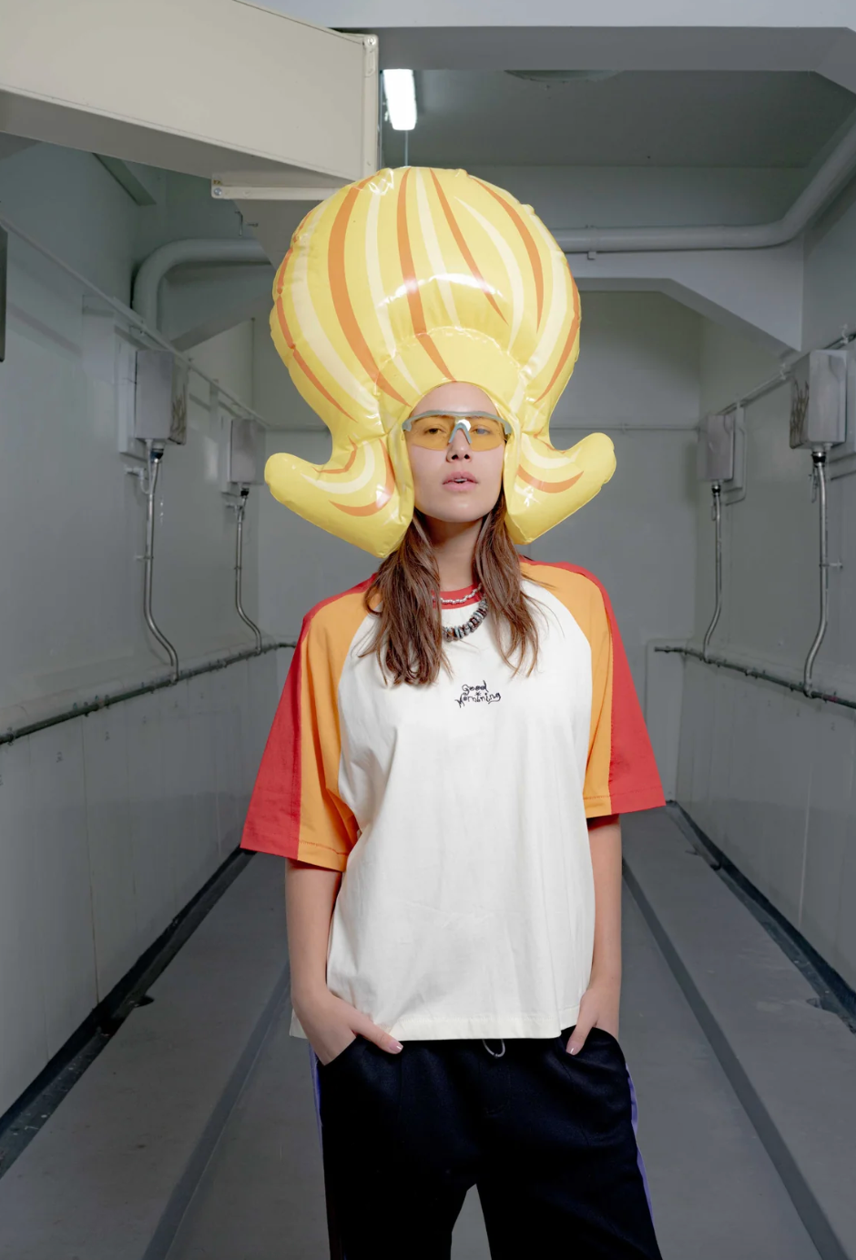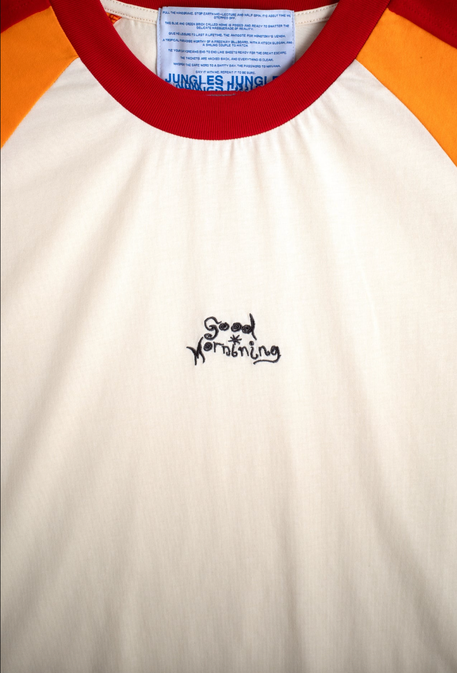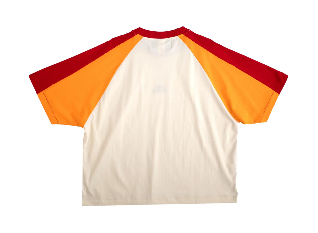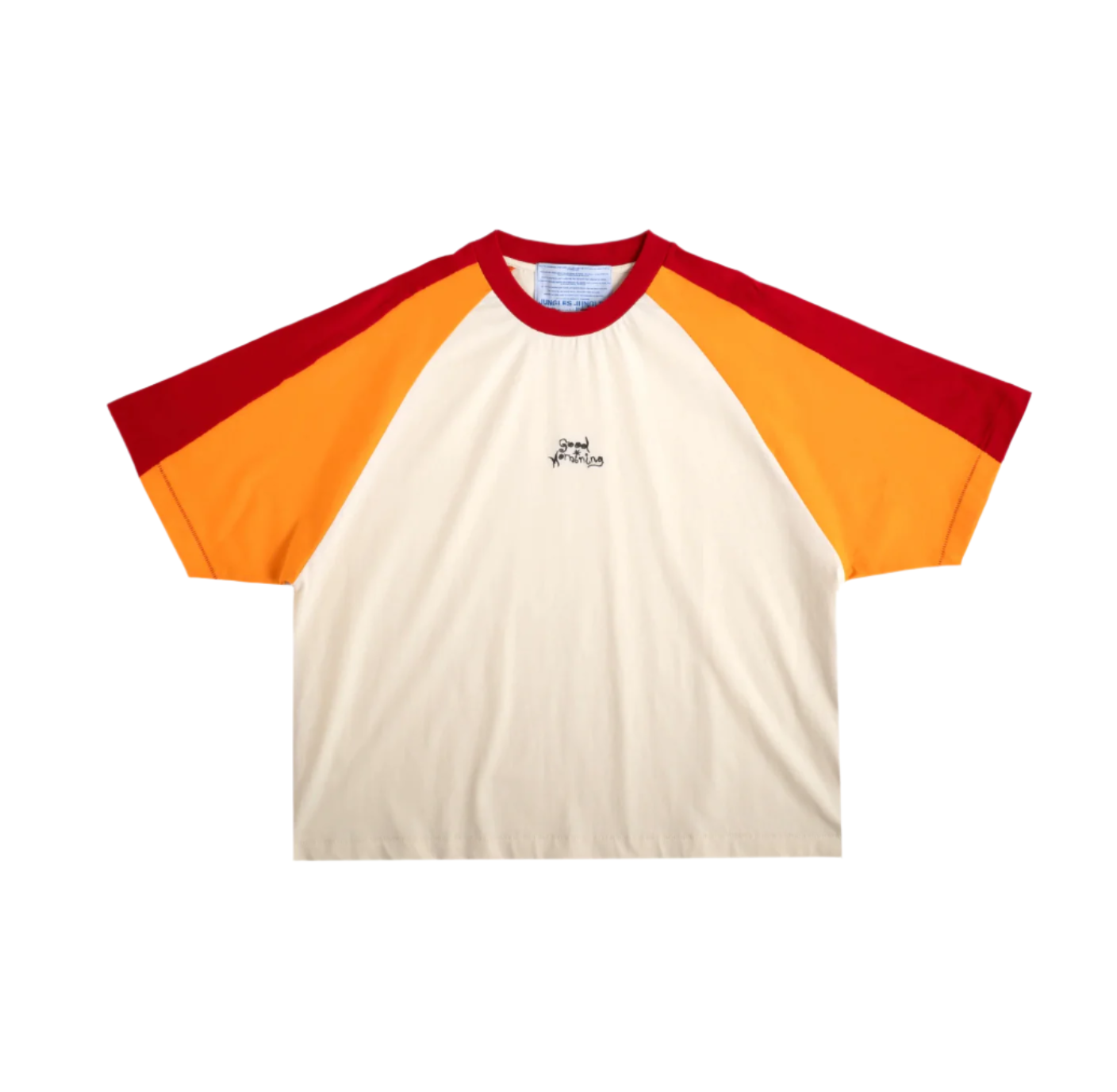 This double layer raglan sleeve tee with raw edge seams and contrast sleeve panels is made from 100% Cotton 220 gsm. Super Boxy/ Relaxed fit. Suggested to order same size as usual.