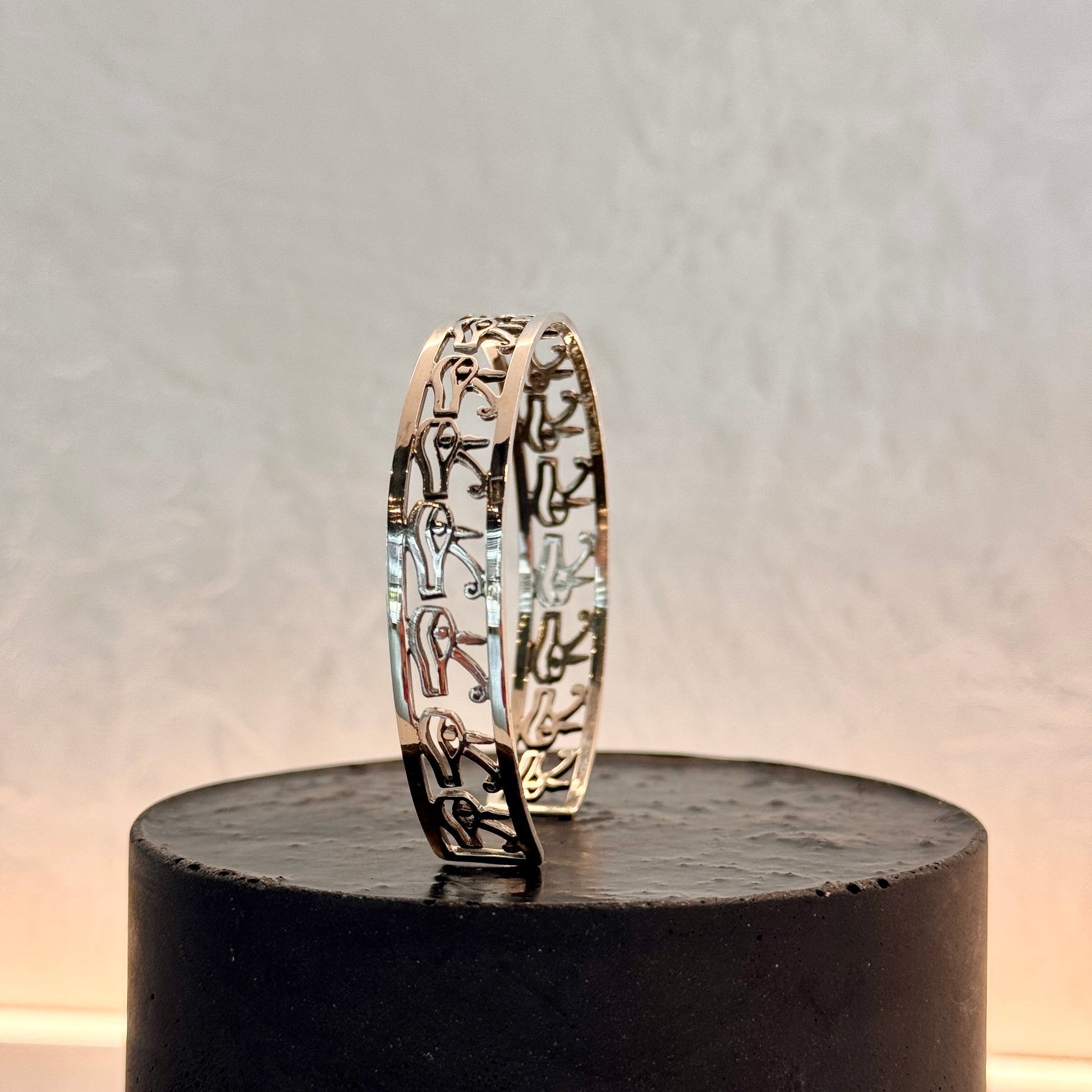 This Egyptian handcrafted .925 silver cuff is adorned with a repeating motif of the ancient “Eye of Horus.”