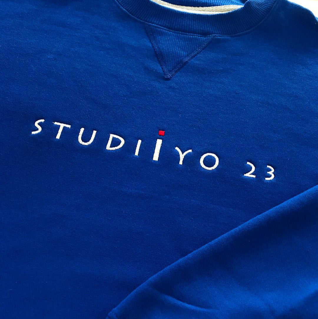Introducing the STUDIIYO23 Embroidered Crew. Simple, our custom Studiiyo23 font is embroidered on a royal blue Champion crewneck sweater.