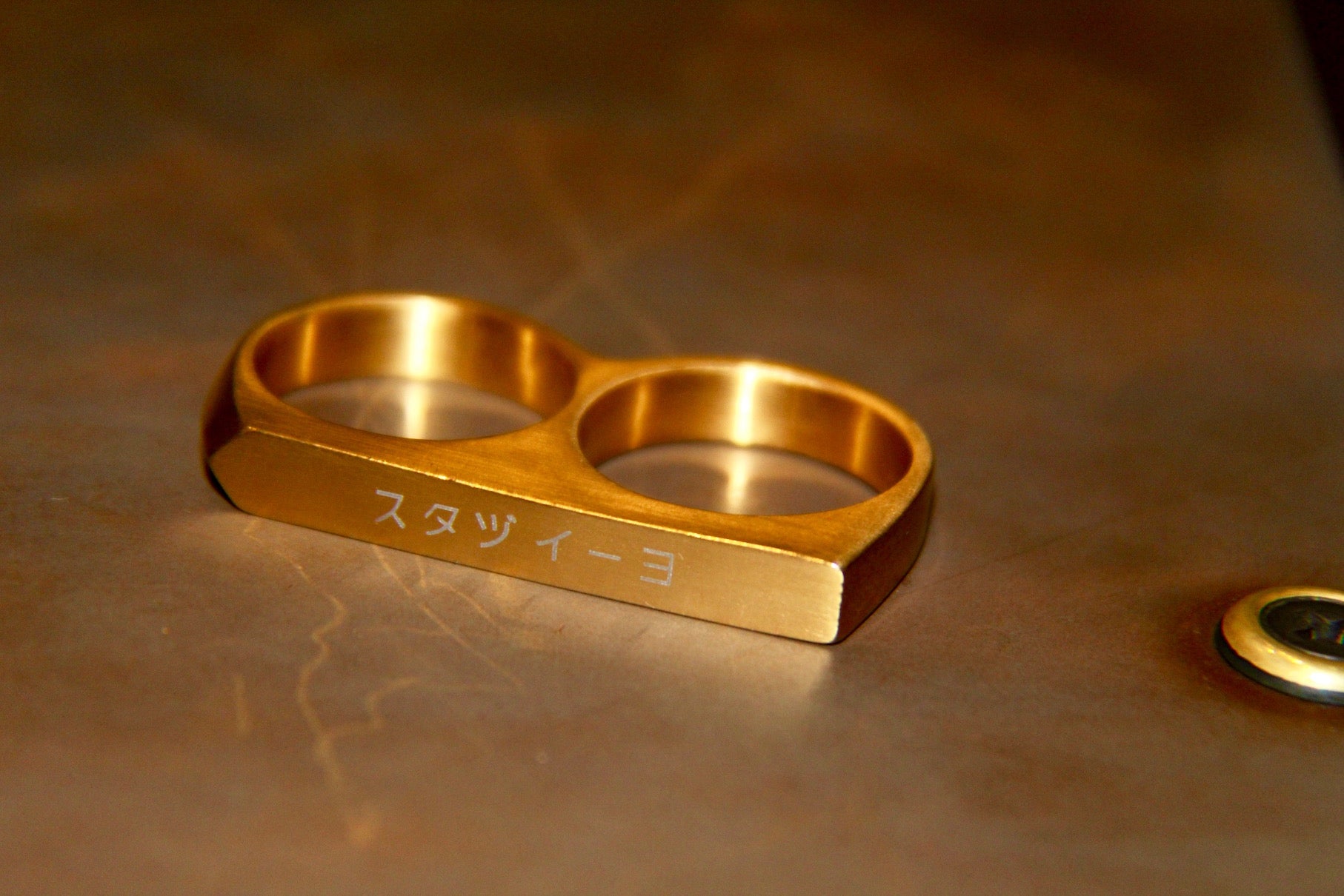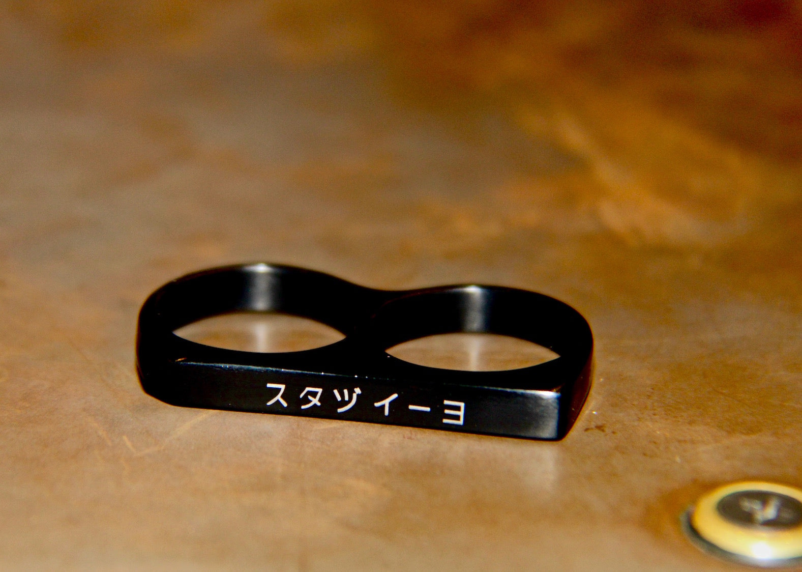 Introducing our スタジイーヨ two-finger steel ring. Forged deep in the heart of Mt. Fuji by way of the Samurai, highly skilled warrior artisans strike stainless steel reminiscent of days that no longer exist. Still they keep to their traditions to create a fit and feel that only they can, similar to the Sword that takes years to forge and mold into the perfect tool...a seamless and natural extension of the warrior's own hand. This ring is an extension of who we are. Art, Fashion, Culture, and Purpose have been meticulously melted into a mold that slides effortlessly onto your own fingers, thus also becoming a part of who you are. Available in our Fuji-Gold and Kansai Triple Black. Three perfect size options. $45.